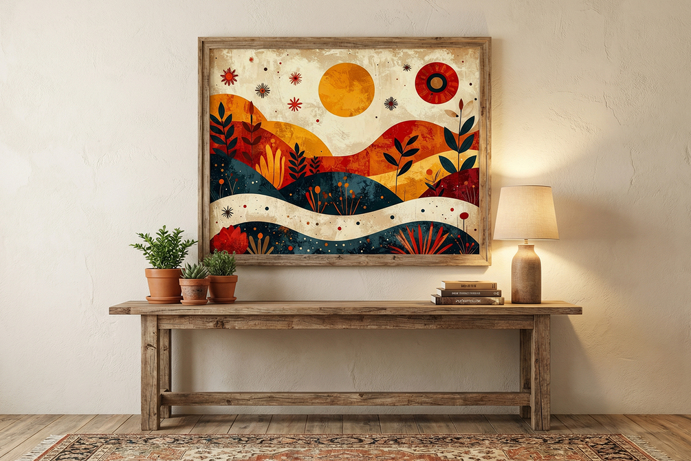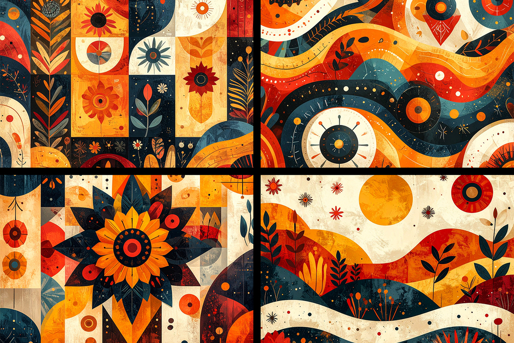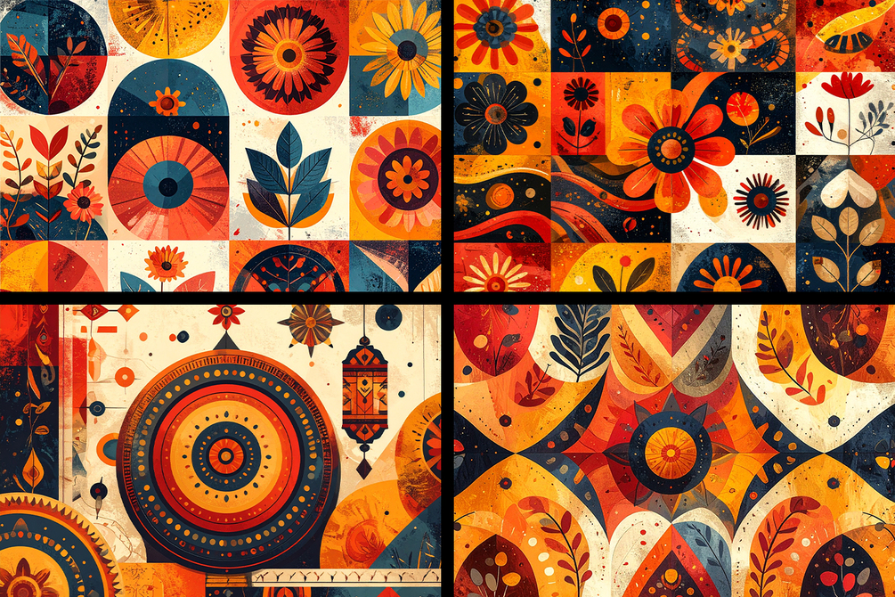 Folk Garden is a collection of symbolic AI-generated abstract background papers inspired by folk-style decoration and handcrafted design. Each piece features simplified floral and geometric motifs, framed panels, and rhythmic compositions, brought together with warm color palettes and a carefully textured, hand-made feel.