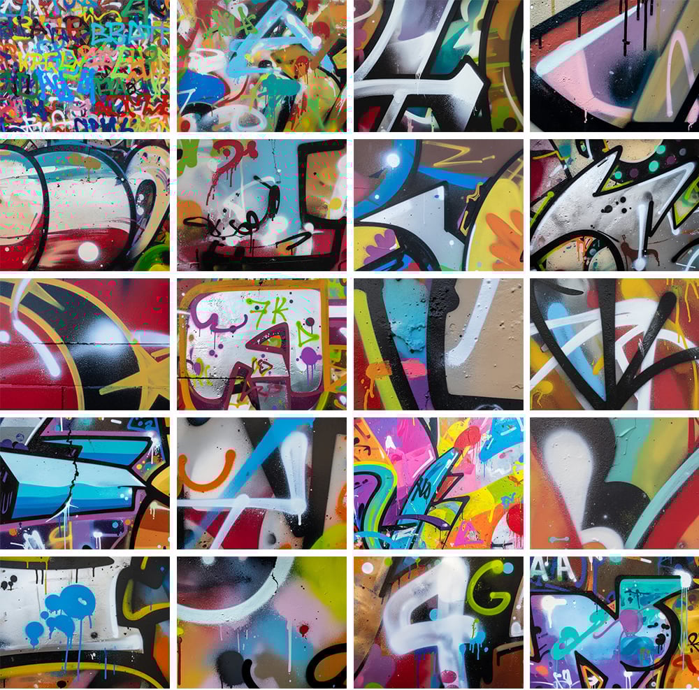 Urban Noise collection includes 20 high-detail graffiti paint backgrounds created as closeup wall textures. Each image is packed with layered spray paint, drips, splashes, tags, and rough surface detail, perfect for adding a bold urban look to your designs.