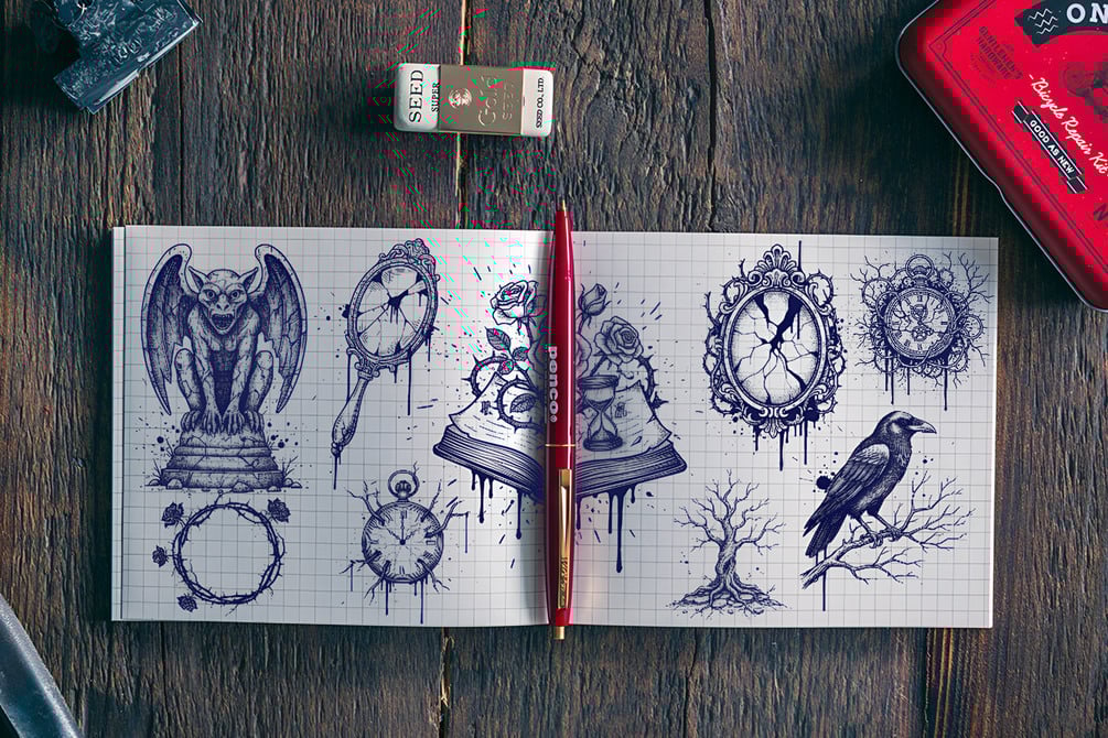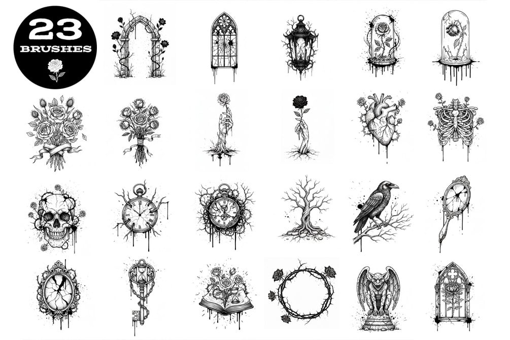 Velvet Ruins is a hauntingly beautiful collection of 23 grunge and gothic Photoshop stamp brushes, created using AI technology for intricate detail and originality. Inspired by decayed elegance and dark romance, this set blends roses, skulls, clocks, and ornate relics to evoke the poetry of time and impermanence. Perfect for moody album covers, gothic collages, vintage posters, or tattoo-inspired art. Each one-click, high-resolution brush adds dramatic flair and texture to your creative projects.